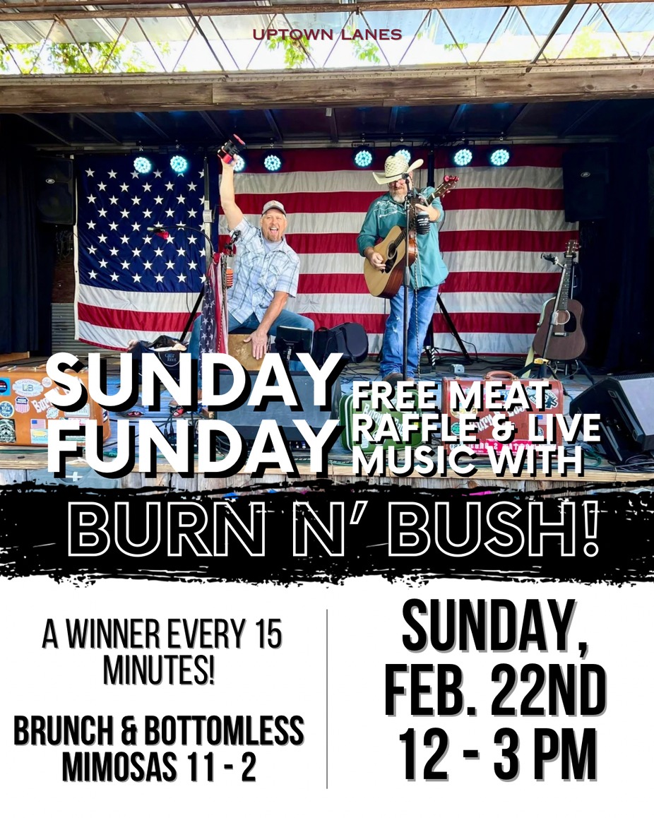 Join us for a special edition of our monthly FREE meat raffle with LIVE MUSIC from your favorite duo - Burn N’ Bush! Just show up, grab some brunch & a bev, and get ready to win something for dinner! We’ll draw a winner every 15 minutes! Try out our brunch menu and BOTTOMLESS mimosas 11-2 and you’ve got the perfect Sunday Funday! $3 Tall boys and chili all day!
