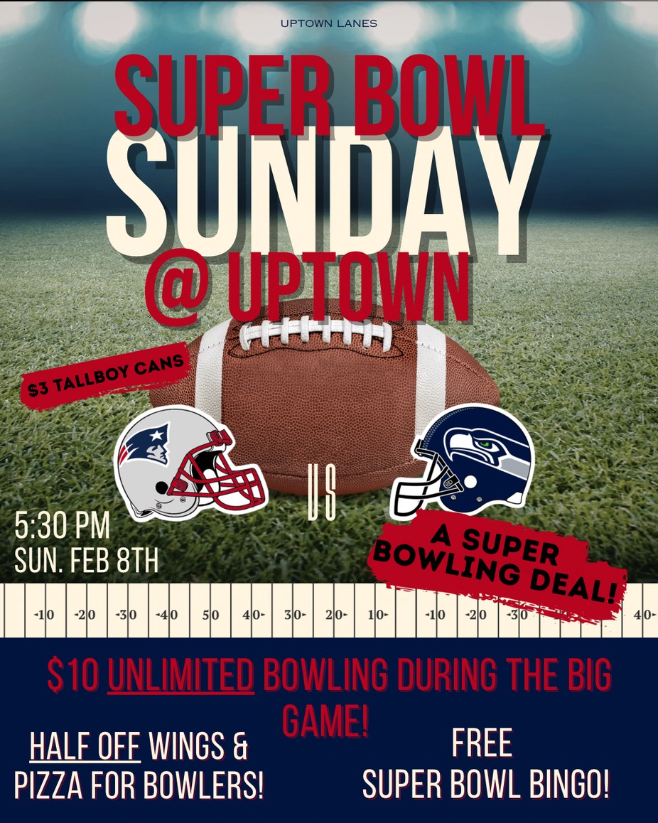 Grab a lane during the Super Bowl for $10 UNLIMITED bowling and HALF OFF wings & pizza for bowlers! Or watch the big game with us and play along with our Super Bowl Bingo! Free to play - just follow along and mark items on your card as they happen. The first 5 Bingos will win a prize! 🏆 $3 Tall boy cans all night and our award winning chili on special!