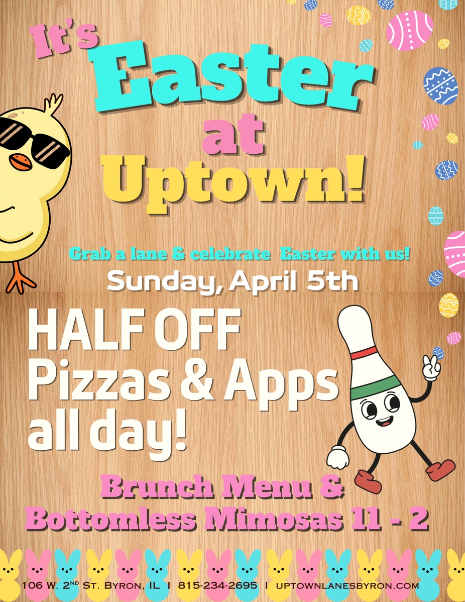 Grab a lane with the family and celebrate Easter with us! Brunch Menu & Bottomless Mimosas 11 -2 & HALF OFF Pizzas and Appetizers all day! Call us at 815-234-2695 or visit us at uptownlanesbyron.com to make your reservation today!