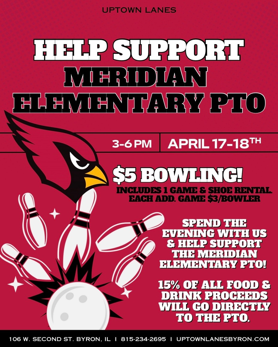 Enjoy an evening out for a good cause! Join us 3-6pm Friday, April 17th and Saturday, April 18th to help support the Meridian Elementary PTO! 15% of all food & drink proceeds during that time will go directly to the PTO! Grab a lane for only $5!